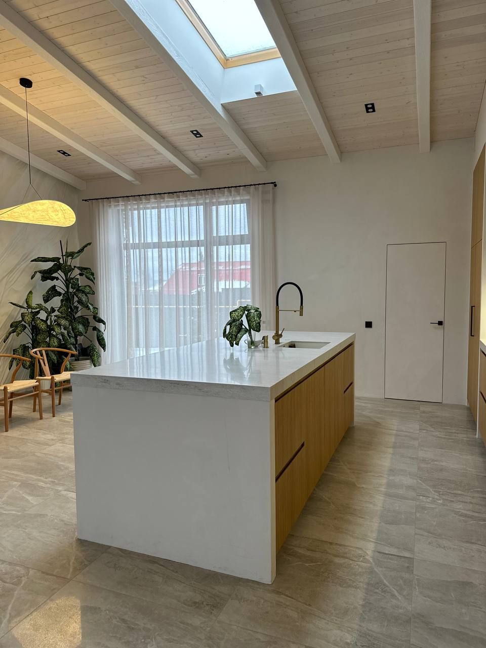 Эта кухня — воплощение основательности и природной красоты. Её сердце — монументальный остров с каменной столешницей: именно здесь собирается семья, рождаются кулинарные идеи и завязываются душевные разговоры