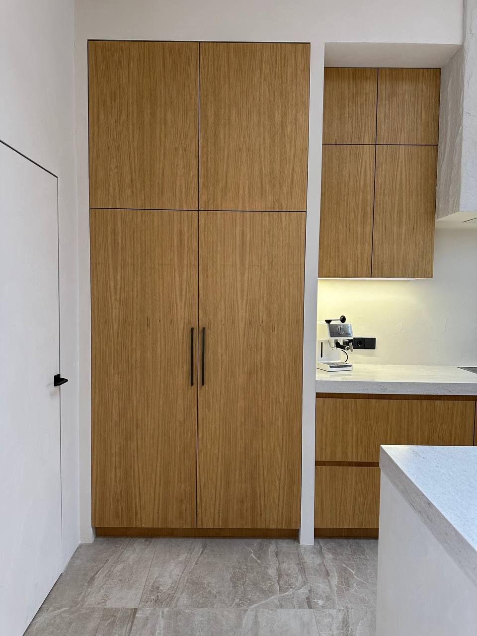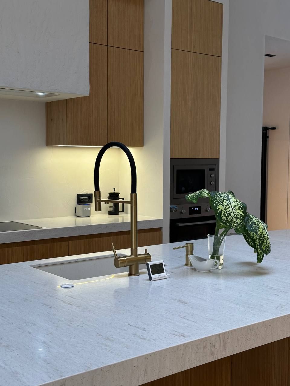 Стиль, прочность и функциональность слились в едином образе. Натуральный шпон с живым древесным рисунком и благородный искусственный камень создают эксклюзивную гармонию — не кричащую роскошь, а сдержанное достоинство качественных материалов и продуманного дизайна. Идеальная гармония